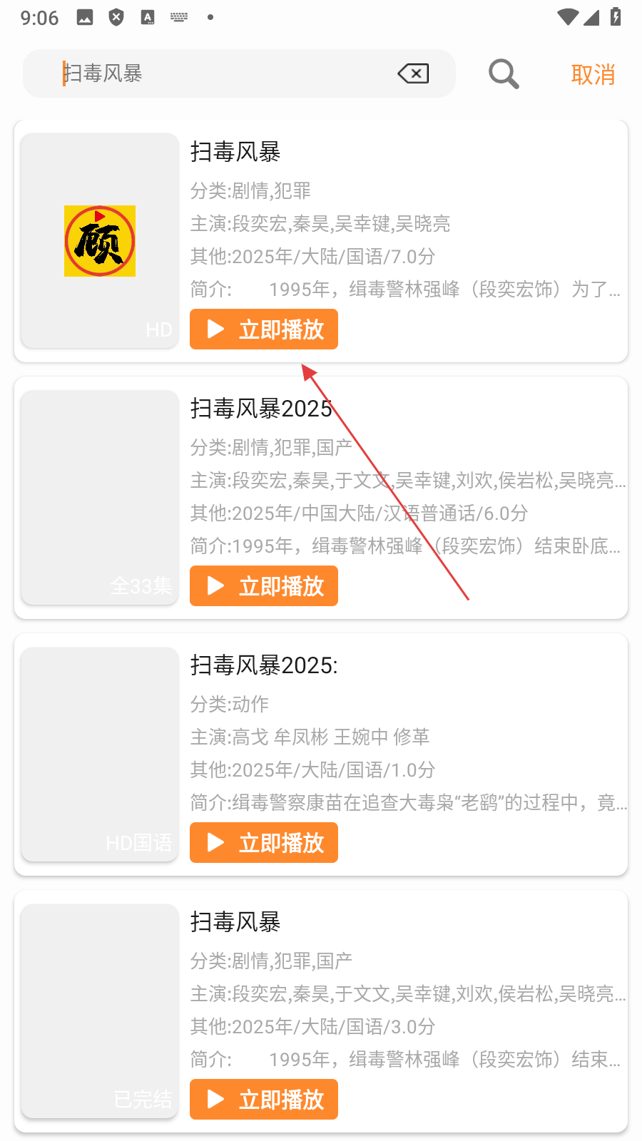 3、在搜索结果页面,点击【立即播放】,进入影视播放页面。