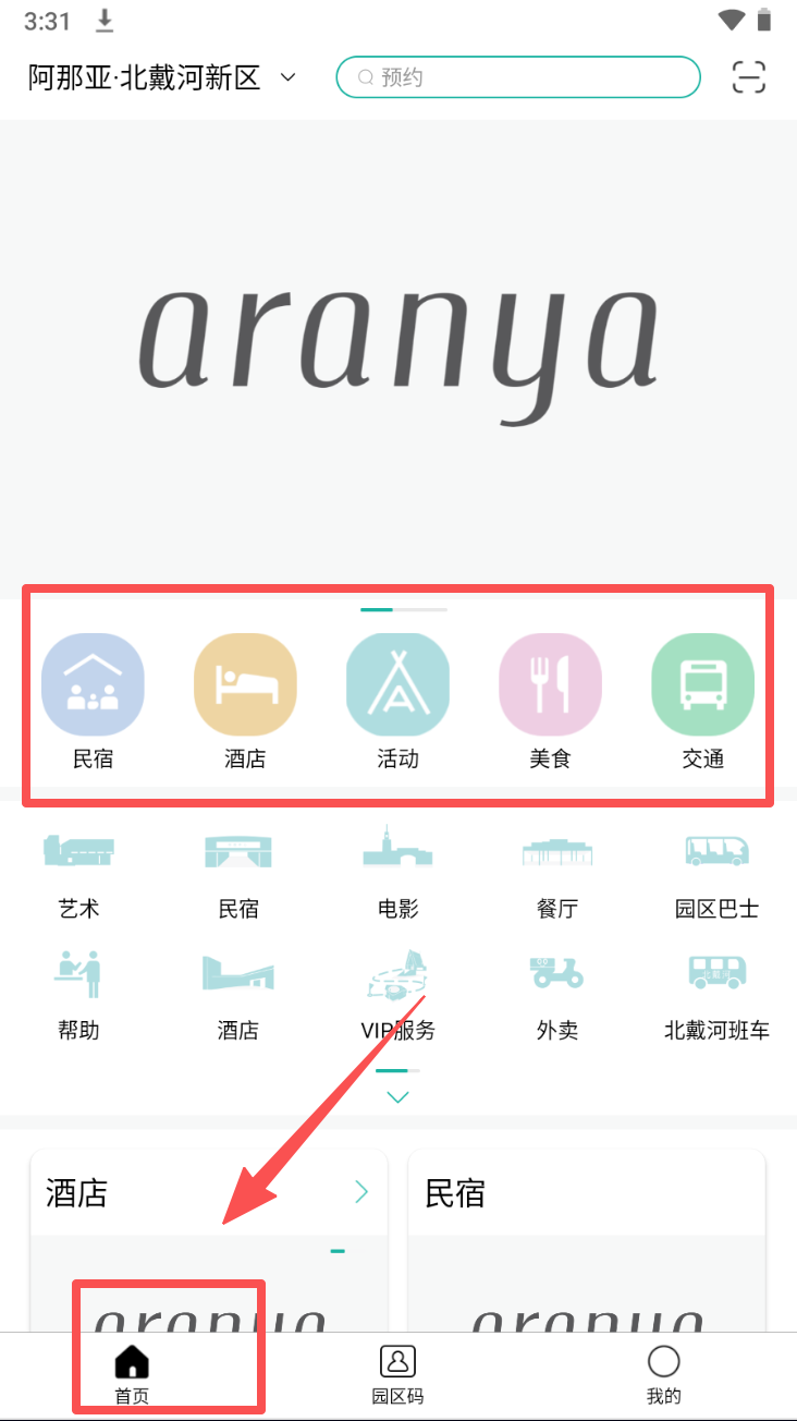 3、在 APP 首页,可看到民宿、酒店等功能图标,能进行相关操作。