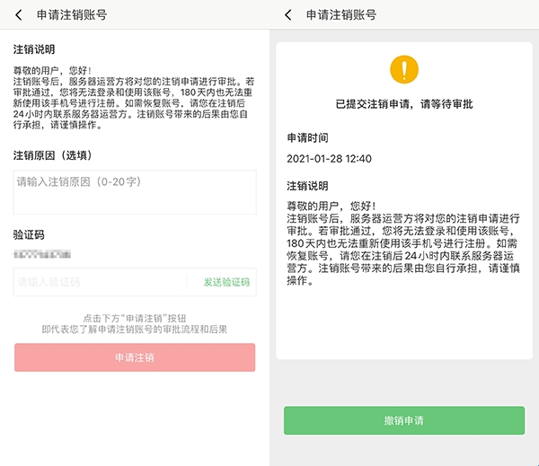 在注销账号后有两种撤回申请的选择
