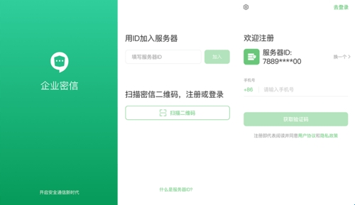 下载企业密信APP,输入服务器运营方提供的服务器ID;搜索到对应的服务器后,输入手机号码,发送短信验证码,填入正确的短信验证码、姓名,并设置密码,完成注册。