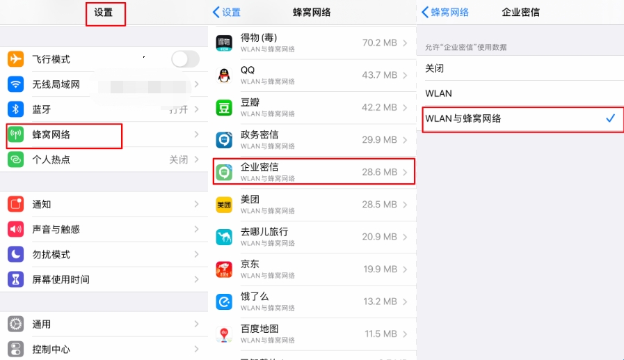 查看是否允许企业密信使用数据网络;