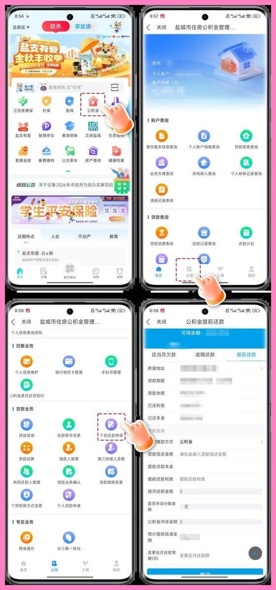 打开“我的盐城”APP→点击“公积金”→点击“业务”→选择“贷款业务”中的“个贷还款申请”→点击“提前还款”,选择还款缴款方式(公积金或银行卡还款等),在贷款偿还金额里填写还款金额→提交。需要注意的是,贷款银行是建设银行或邮储银行的,需先到放款银行办理个人用户扣款签约后,才能办理。