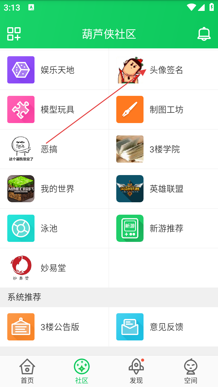 1、打开葫芦侠三楼进入首页,点击底部【社区】进入社区界面。