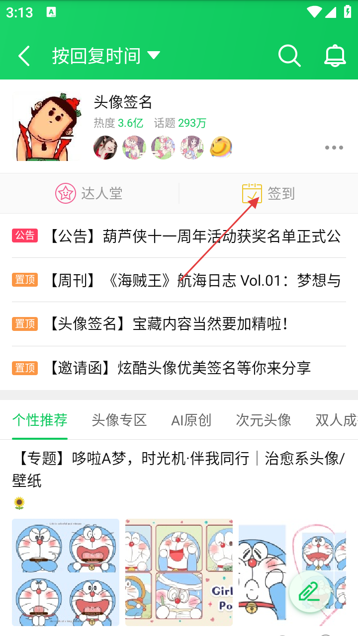 3、以头像签名为例,点击【签到】。