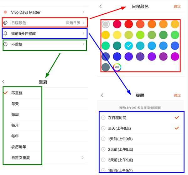 3、在【新建日程】页面,可进行设置颜色,提醒时间,及是否重复的选择;