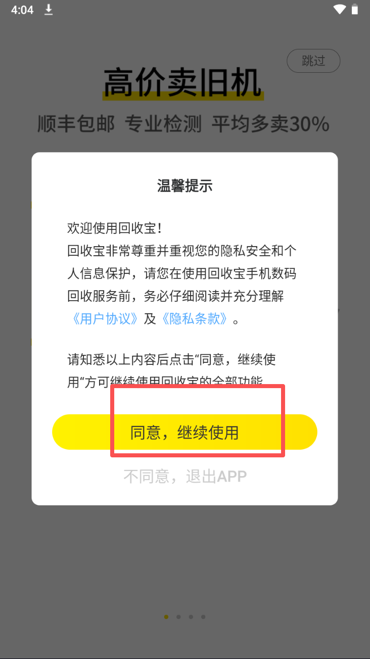 1、同意用户协议和隐私政策。点击“同意,继续使用”以接受协议。