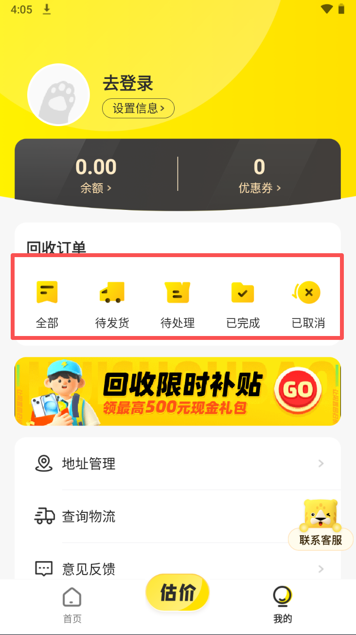 4、查看和管理回收订单。在“我的”页面查看回收订单状态。