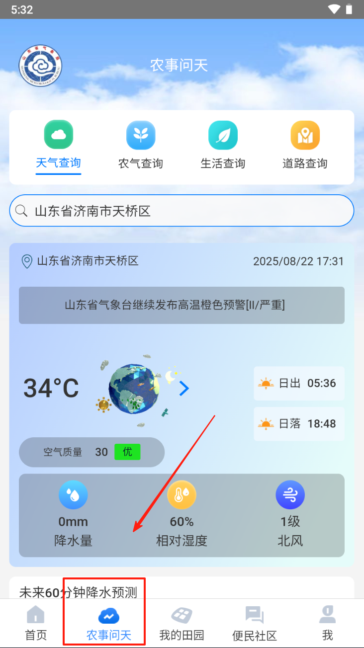 2、查询农事天气。点击“农事问天”图标,获取特定地区的农业相关天气信息。