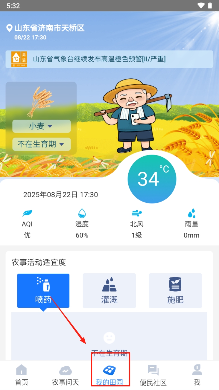 3、获取农事活动建议。点击“我的田园”图标,查看当前农事活动的适宜度。