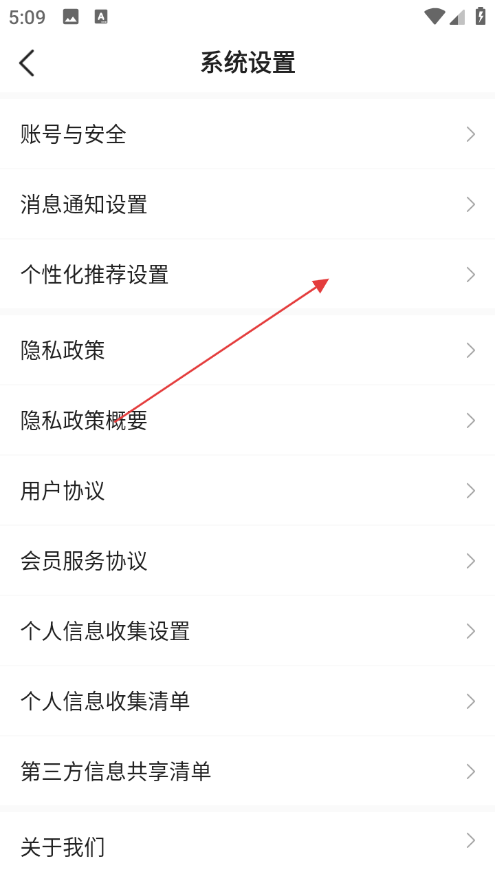 3、在系统设置页面,点击【个性化推荐设置】选项,进入个性化推荐设置页面。