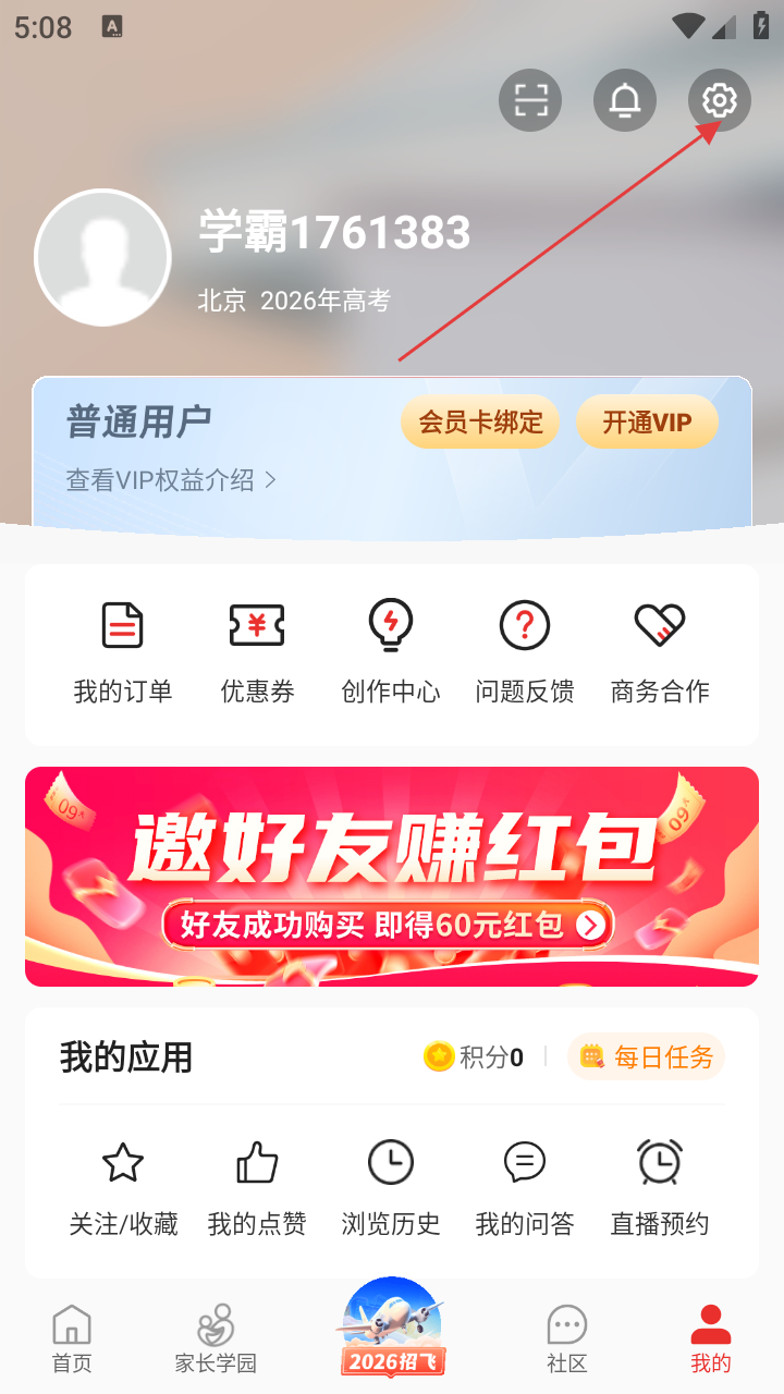 2、进入个人中心后,点击右上角设置图标,进入系统设置页面。