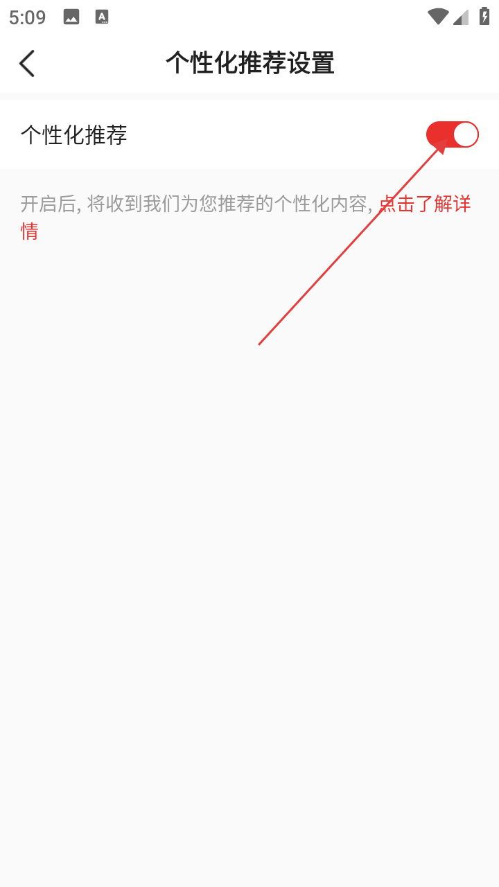 4、在个性化推荐设置页面,可根据需求开启或关闭【个性化推荐】功能,开启后将收到个性化内容推荐。