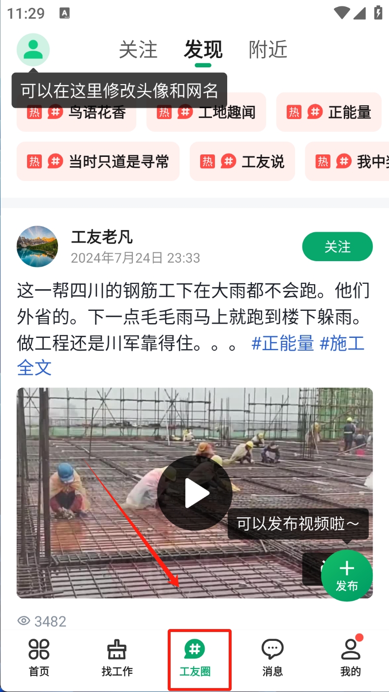3、在“工友圈”页面,参与社区互动,分享和查看工作相关视频。