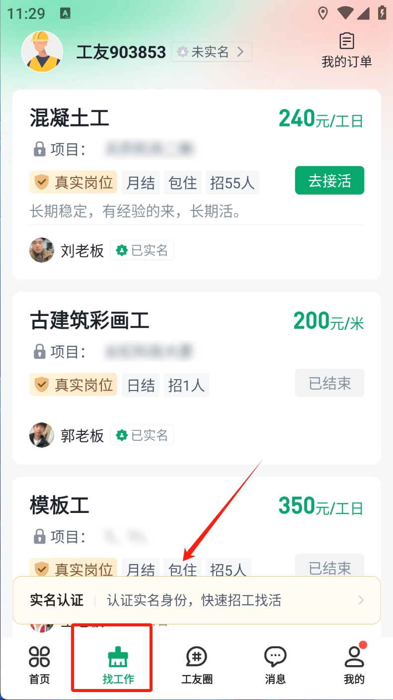 2、点击“找工作”选项,浏览不同工种的招聘信息。