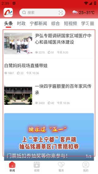 1、进入“掌上宁都”首页,可浏览【头条】【时政】等栏目新闻,如区域医疗建设、家风传承等资讯。