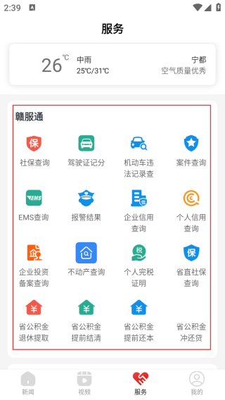 4、进入【服务】页,使用【赣服通】提供的社保、驾照、不动产等查询及办事功能。