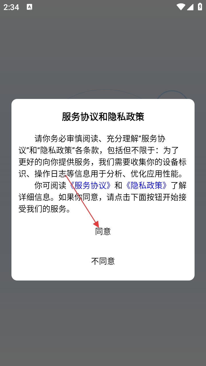 1、首次打开应用,遇【服务协议和隐私政策】弹窗,点击【同意】以继续。
