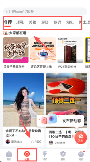 2、浏览社区:点击“社区”标签,查看推荐内容和用户动态,发现热门商品。