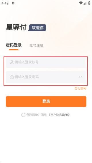 2、在星驿付登录页,于【请输入登录账号】和【请输入登录密码】框,分别填入账号密码。