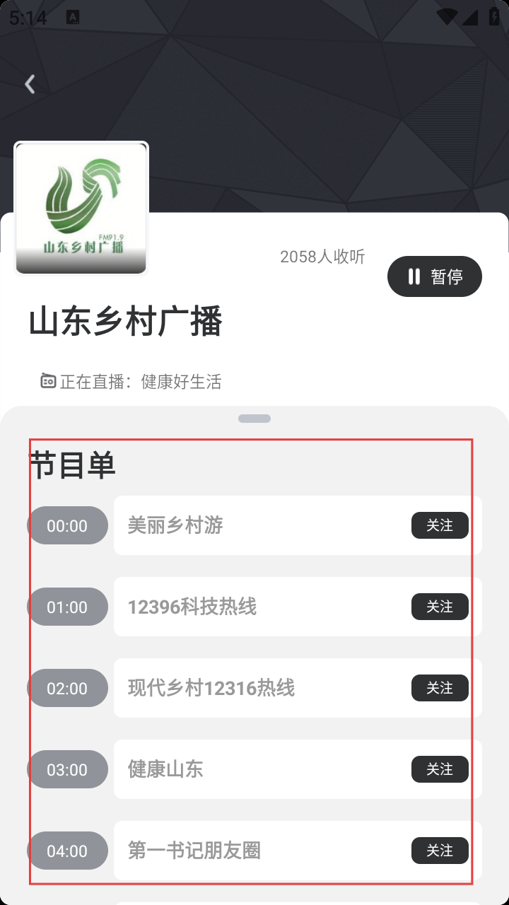 4、进入电台播放页,比如【山东乡村广播】,能看节目单,还有暂停键,可根据节目单关注喜欢的节目。