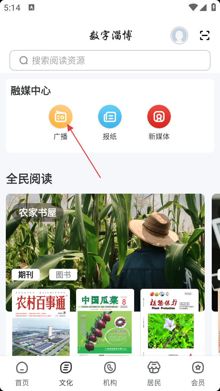 2、进入【文化】页,能看到【融媒中心】,里面有【广播】【报纸】【新媒体】,点击【广播】图标。