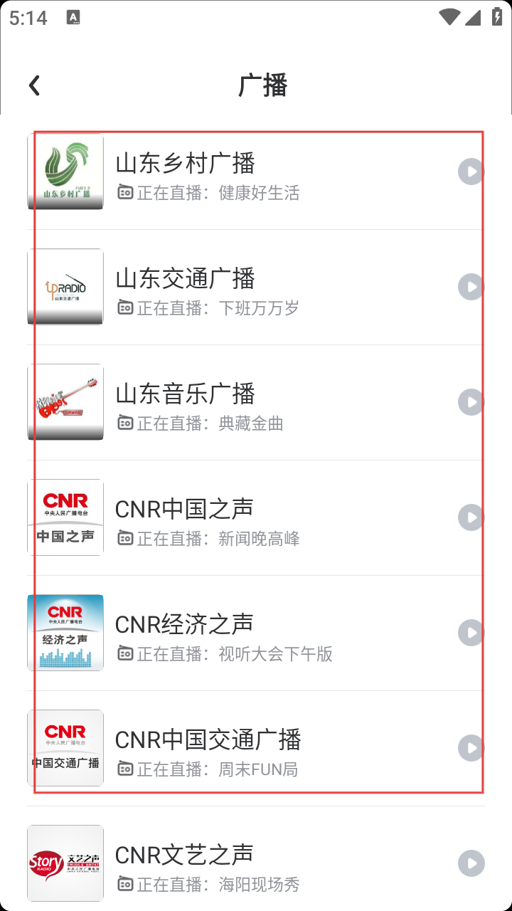 3、在【广播】页,有【山东乡村广播】【山东交通广播】等多个电台,选想听的电台点右侧播放键。