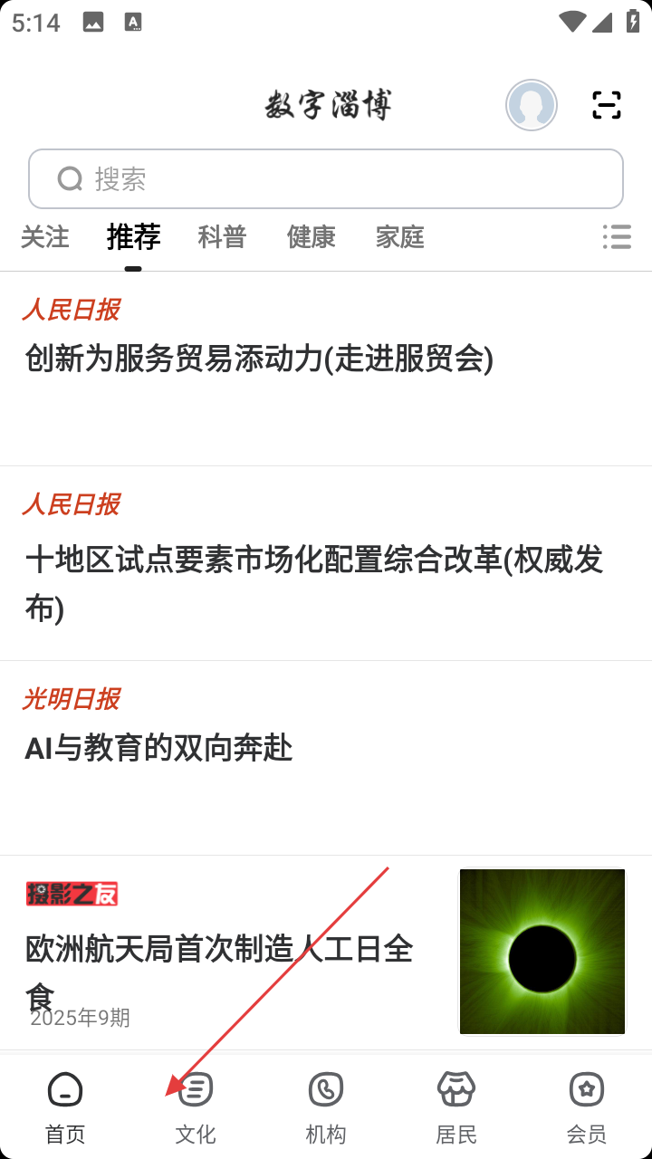 1、打开【数字淄博】,首页有搜索栏和多栏目,想听广播就点击底部【文化】按钮。