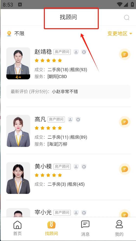 2、接着,点击“找顾问”选项,搜索并选择一个房产顾问进行咨询。