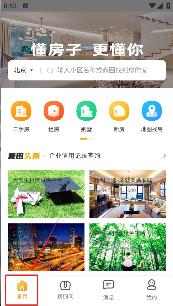 1、首先,打开应用并点击首页,浏览不同的房产选项,如二手房、租房等。