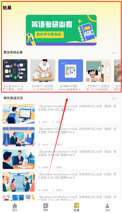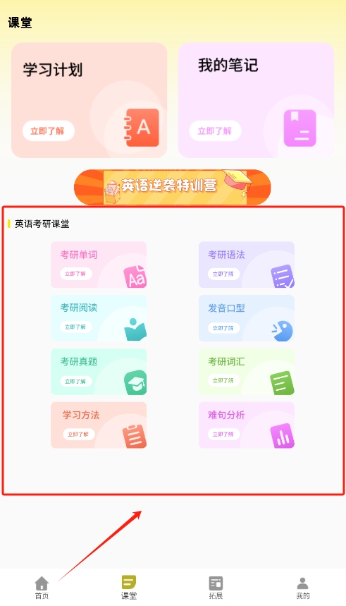2、在课堂模块中,用户可以轻松找到考研相关课程,并通过一键学习功能快速掌握核心知识,提升专项能力。