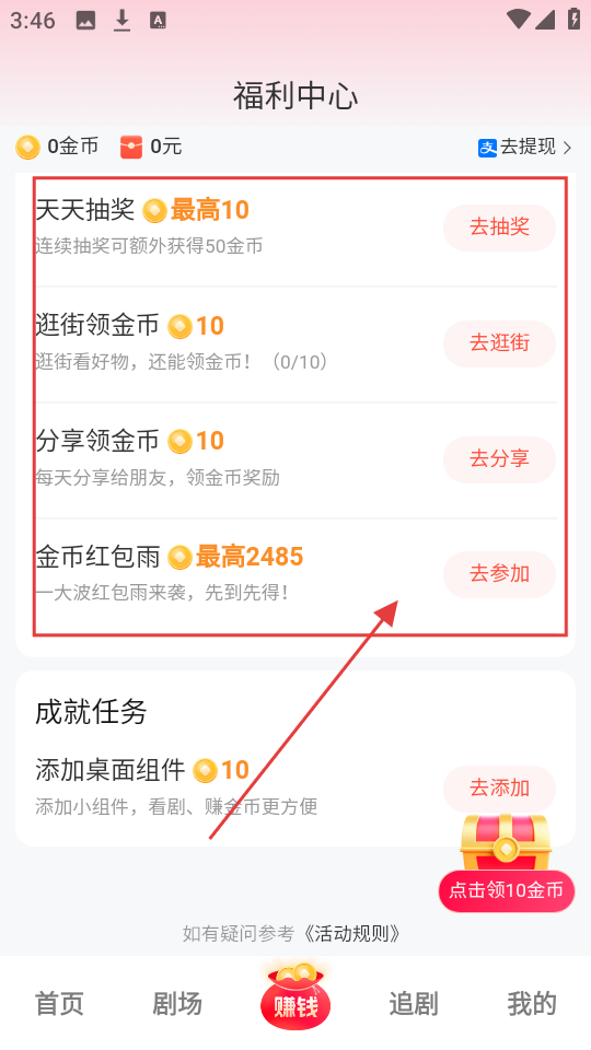 3、福利中心还有天天抽奖、逛街领金币等活动,若想参加【金币红包雨】,点击【去参加】就能参与。