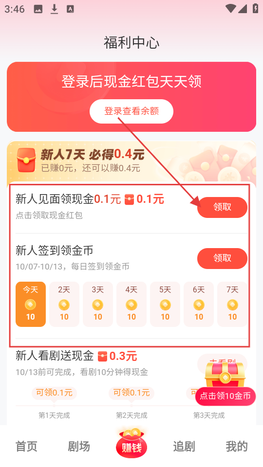 2、在福利中心,能看到新人福利,像新人见面领现金、新人签到领金币等,点击对应【领取】按钮即可领取。