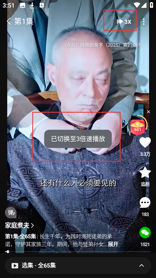 4、选择好倍速,比如3X后,页面会提示【已切换至3倍速播放】,此时剧集就会按照所选倍速播放啦。