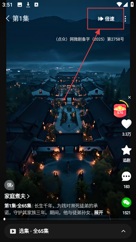 2、进入剧集播放页面后,若想调整播放速度,点击页面右上角的【倍速】按钮,就能打开倍速设置选项。