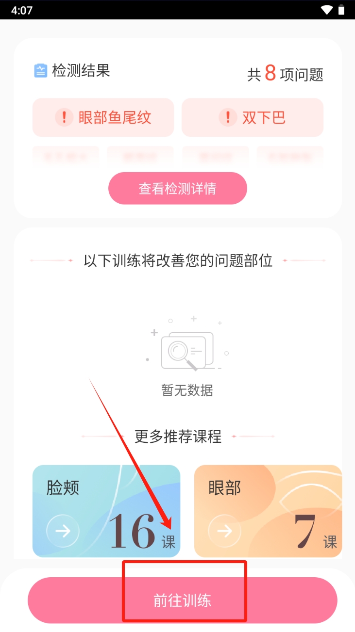 3、查看检测结果,点击“前往训练”按钮,开始改善您的皮肤问题。