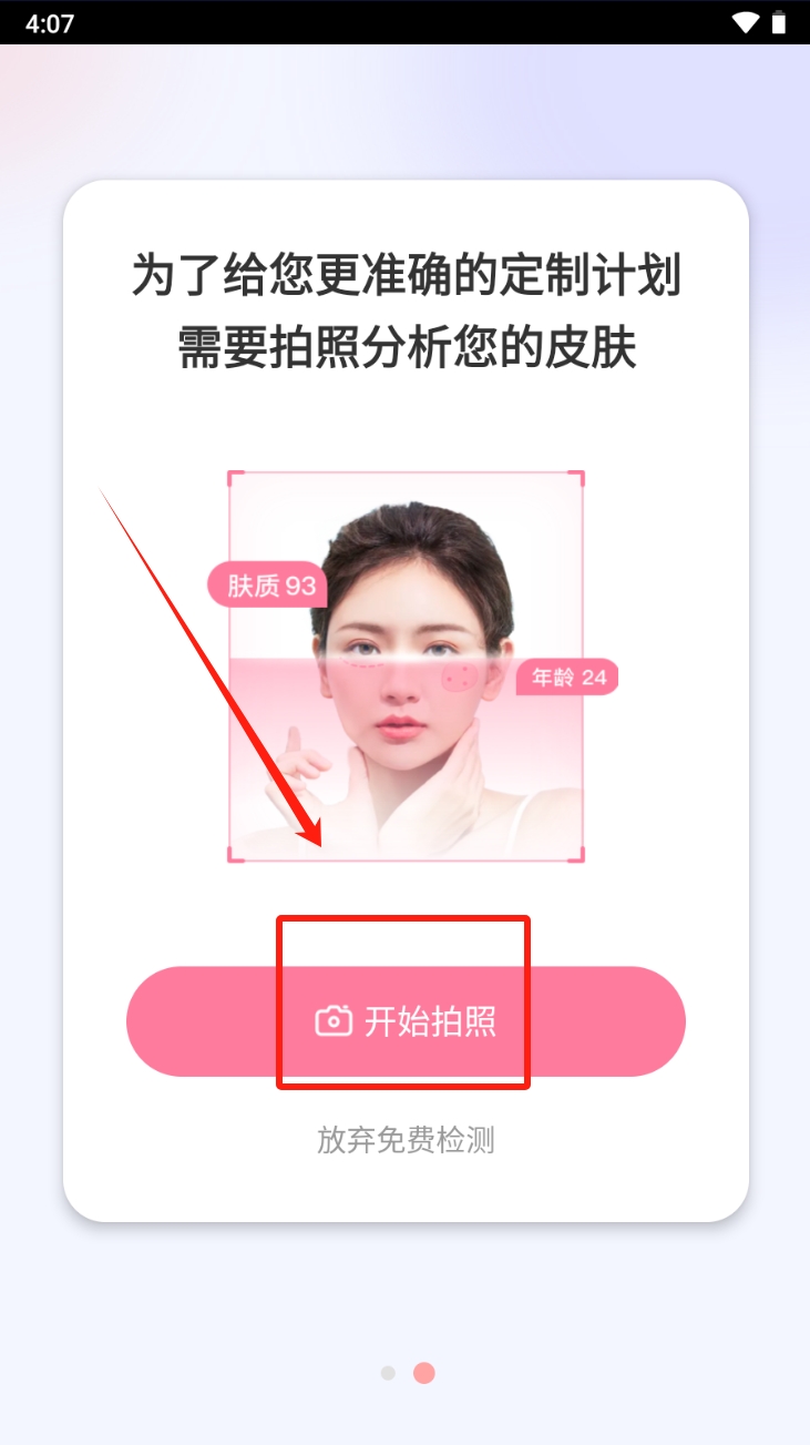 1、点击“开始”按钮,进入应用并开始定制您的护肤计划。