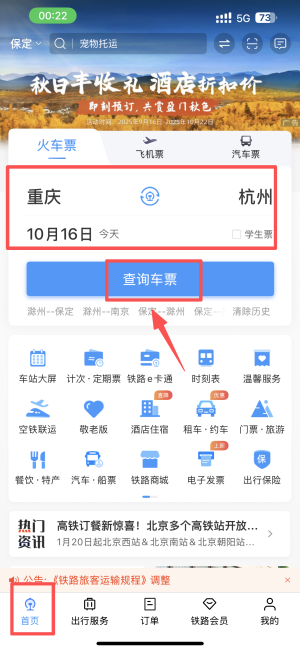 1、在首页输入出发地、目的地和日期,点击“查询车票”。