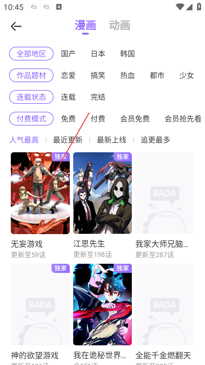 2、在分类页面,可通过【全部地区】【作品题材】【连载状态】【付费模式】等筛选条件,精准找到心仪的漫画作品。