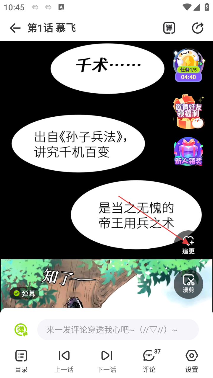 4、在阅读界面,可点击【追更】功能关注漫画更新,还能参与评论、切换章节等,提升阅读体验。