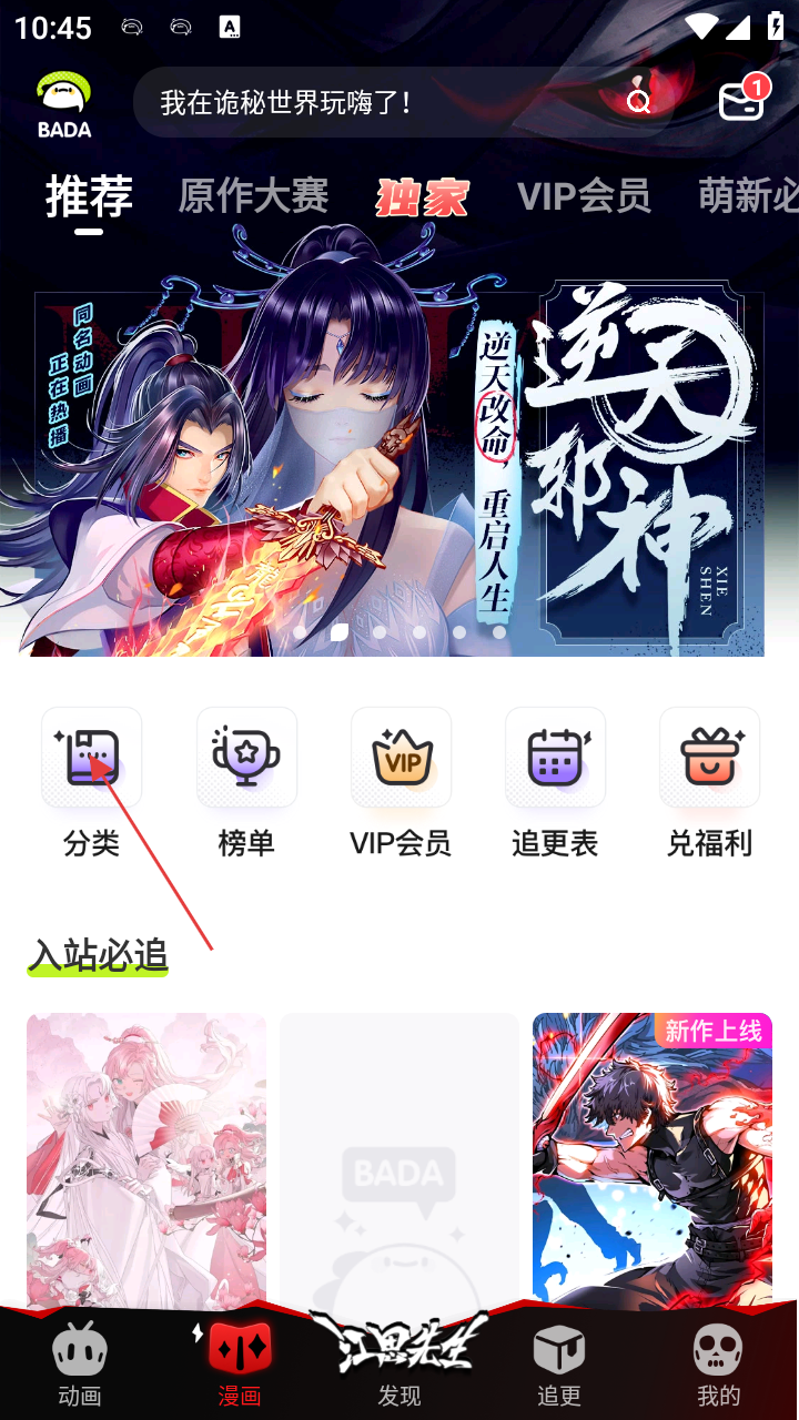 1、在软件首页,可浏览推荐漫画,点击【分类】进入漫画分类页面,还能通过榜单、VIP会员等功能查找资源。