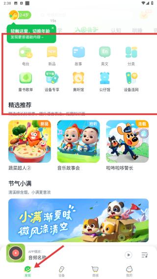 3、登录成功后,返回【发现】页面,浏览电台、新品、故事、英文、分类等板块,选择感兴趣的音频内容。