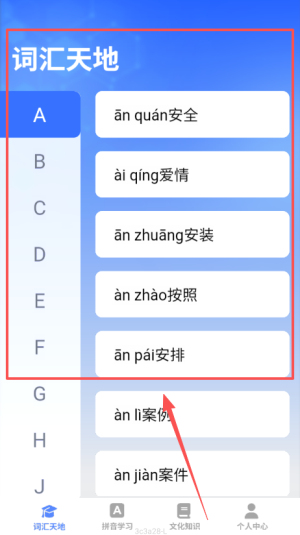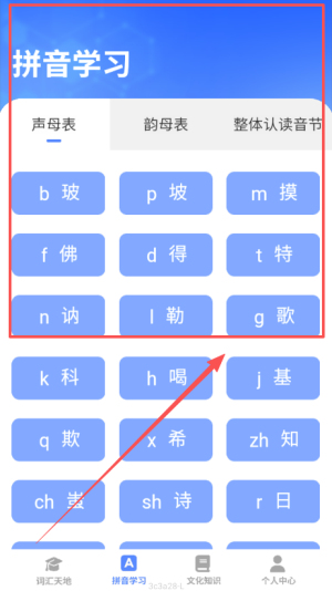 2、在主界面,选择需要学习的汉字,系统提供详细的音节解析,确保用户能够精准发音,从而打下良好的基础。