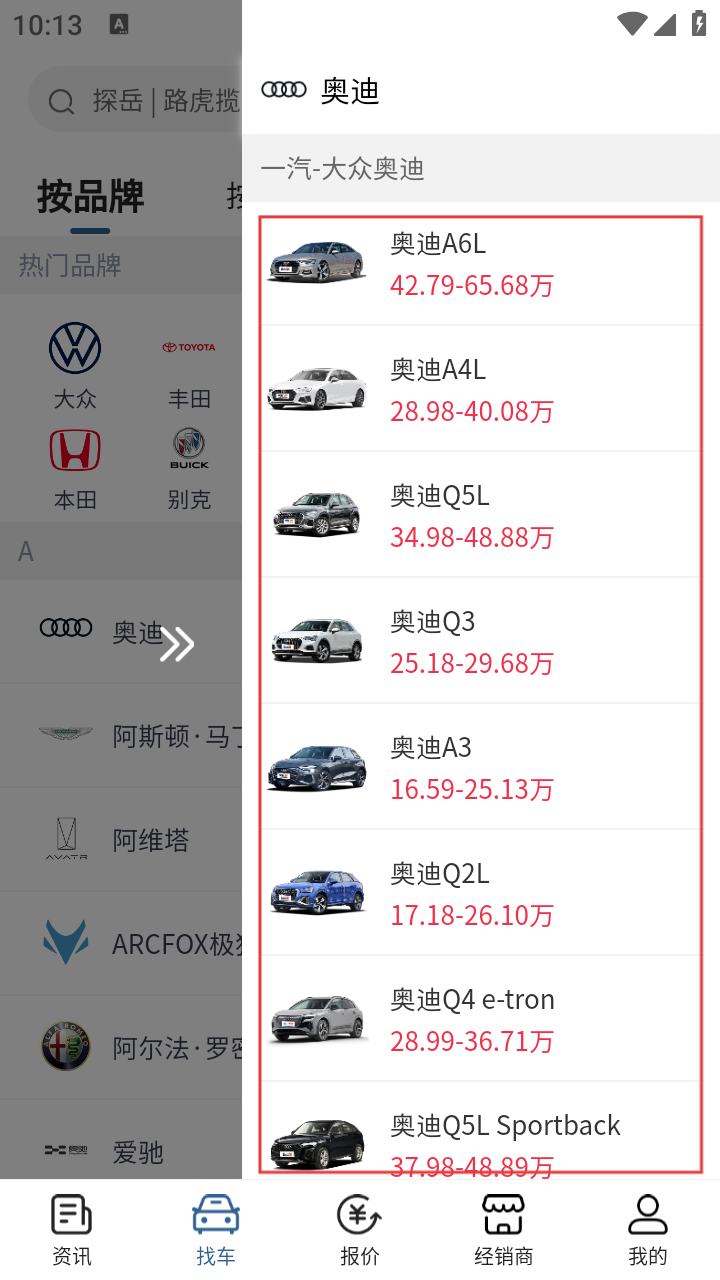 3、进入品牌列表后,浏览车型,像选奥迪A6L就点击对应车型,查看车型详情及价格。