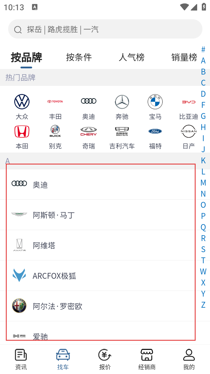 2、在找车页选【按品牌】,滑动找对应汽车品牌,比如找奥迪就点【奥迪】进入品牌车型列表。