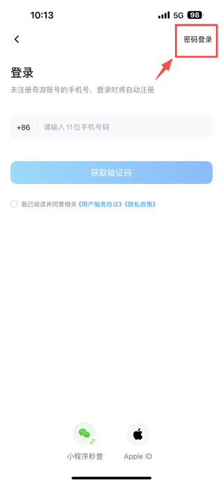 3、在登录页面,点击右上角密码登录选项,切换密码登录模式。