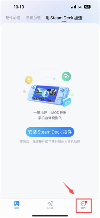1. 开启游戏加速类应用,点击底部“我的”选项,进入个人中心界面。