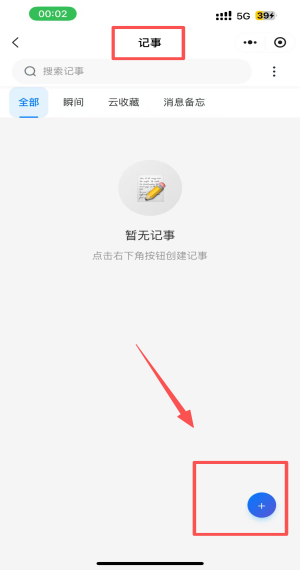 2、点击“记事”标签,点击“+”按钮添加新记事。