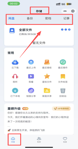 1、用户登录应用后进入到【存储】页面下点击上方的【文件】图标