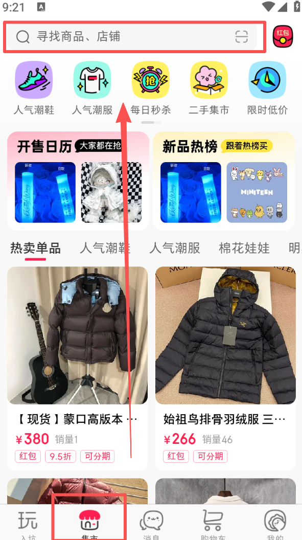 1、打开软件,点击底部 “集市”,在集市页面顶部搜索框输入商品或店铺关键词。