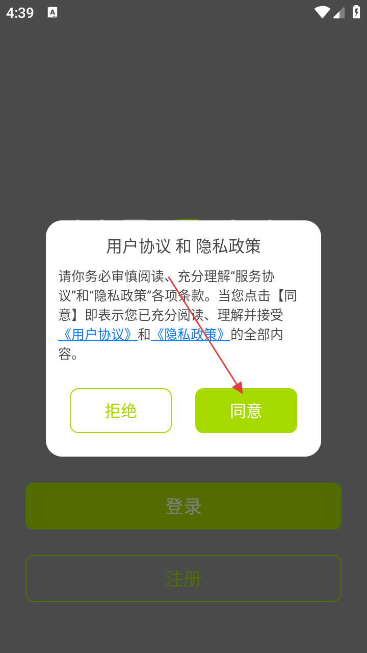 1、打开悠瑞服务,在弹出的“用户协议和隐私政策”提示框中,点击【同意】按钮,进入应用主界面。